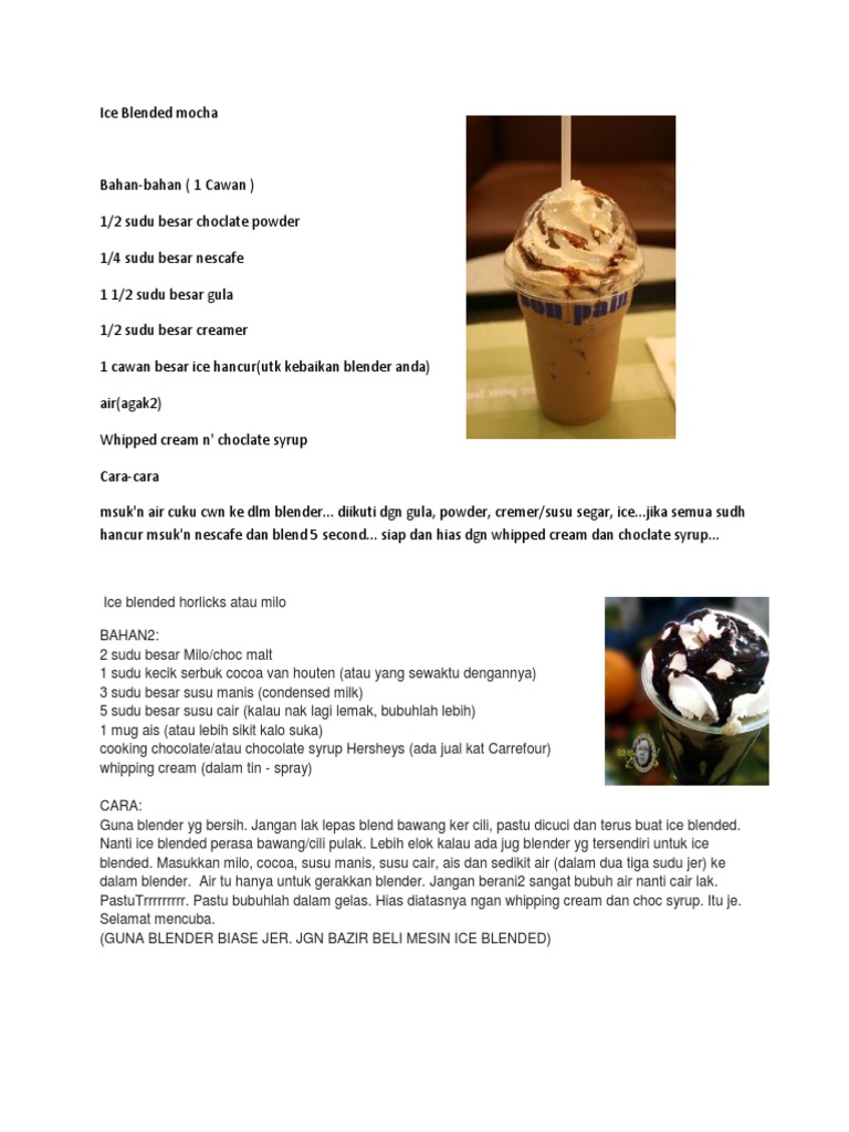 Cara membuat ice blended Sunday January 16 2022 Edit. Anda boleh tukar milo ini dengan serbuk nescafe or coffee tapi kalau nak ice blended korang tu sedap boleh cuba campurkan nescafe coffee tak perlu kuantiti yang banyak untuk coffee nanti tak sedap 2. Bahan Bahan Caramel Ice Blended Coffee.